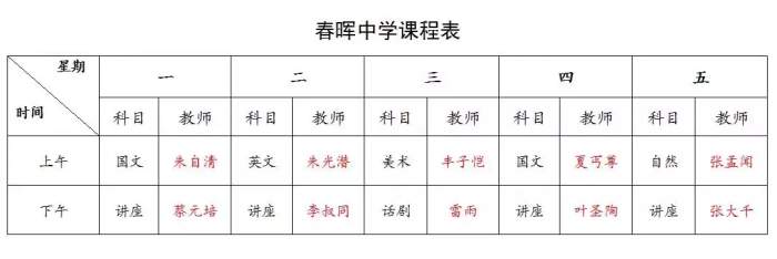 如果你在春晖上学,有可能拿到这样一张课程表。