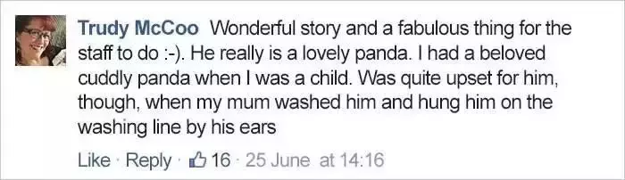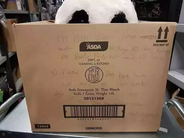 小Leon的这个纸箱子后来被超市的工作人员发现了,大家被小家伙的一片真心给暖到,决定集资把这个熊猫玩偶买下了送给这个未来的小主人,于是寻找Leon的帖子就在网上一传十,十传百地传开了~~