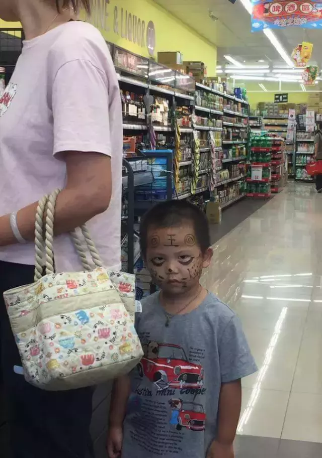 没错,这是亲妈,用马克笔在自家儿子脸上画满雀斑、眼袋、胡须以及“王”字后带出门溜达逛超市的场景!