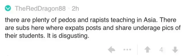 有太多恋童癖和强奸犯去亚洲教书了。在一些“深网”上,有些去外面教书的人会分享他们未成年学生的照片,真是恶心。