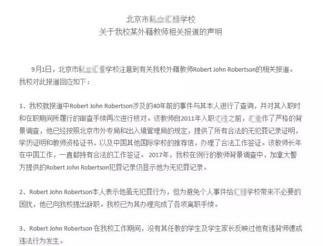 事情曝光后,家长们纷纷投诉,该国际学校也做出了解释,称Robert没有向学校报备自己的前科,甚至提交了无犯罪证明记录,这么多年的教学也没有任何不良记录。为避免因为个人事件给学校带来困扰,Robert已递交辞职,学校也已经完成受理了。