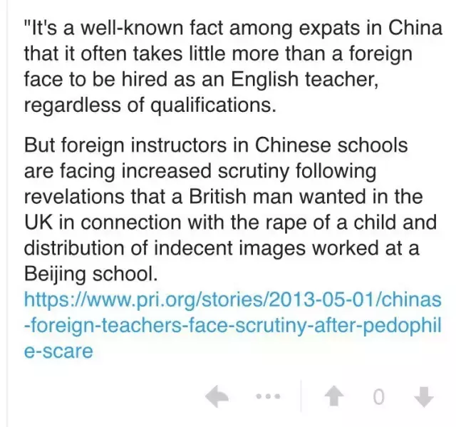 这在中国的外籍人士中是一个众所周知的事实,无论有没有文凭,只要是张外国脸就很容易在这儿当老师。不过在中国学校的外国老师还是审核越来越严,比如说,一个在北京学校工作的英国人,被问到他在英国强奸儿童,发布不雅照片的事情。