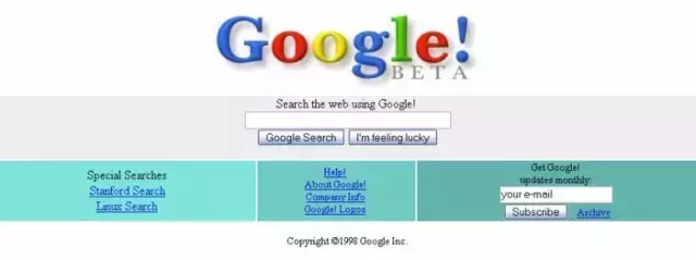 Google1998年的页面,标识后面也有个惊叹号,可能在模仿Yahoo!