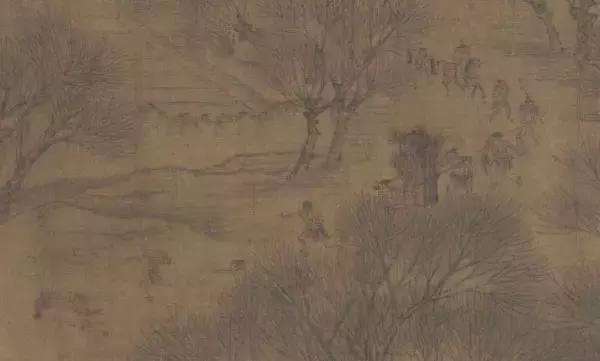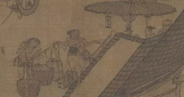 ▼这个细节展示了一个官宦出游的场面。清明节到了,士大夫们就要出城踏青。前面五个开道的,两个牵马的,后面两个挑东西的。