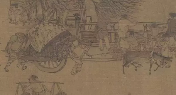 ▼在郊外,一些私船停在岸边,有人把船上的粮食背进河边的饭馆和铺子。