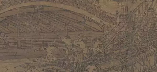 船头上的人紧张起来。船中央的船夫着急放在桅杆,一船夫用竹竿抵住桥身,避免相撞。岸上河桥上的人在旁边看着热闹。