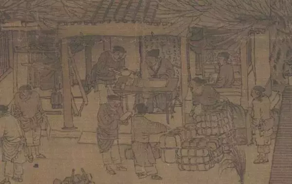 《清明上河图》中街道两边全是店铺,其中饭馆茶馆最多。