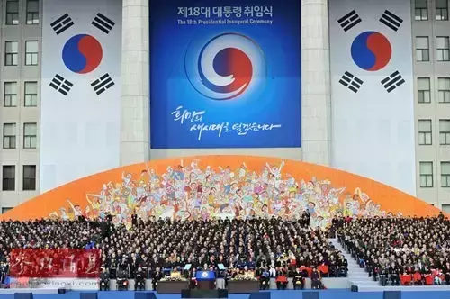 朴槿惠就职仪式现场,后面的标语为“开创希望的新时代”
