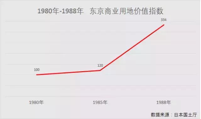 日本国土厅公布的数据显示,1980年,东京的商业用地价值指数为100;1985年,涨到120;1988年,暴涨至334。1988年,东京的住宅用地价格,与1985年相比,也上涨了2.1倍。