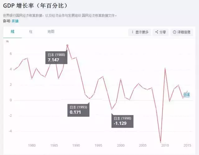 日本GDP增长率,从1988年的7.1%,猛跌至1993年的0.17%,1998年出现了负增长,日本进入了所谓的“失去的20年”。