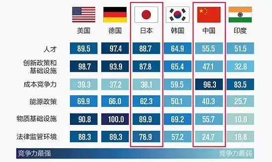 事实上,中国制造业的国际竞争力,很大程度上归功于人工和材料成本方面的优势。在人才、创新政策、基础设施等方面,中国与日本,差距仍然很大。