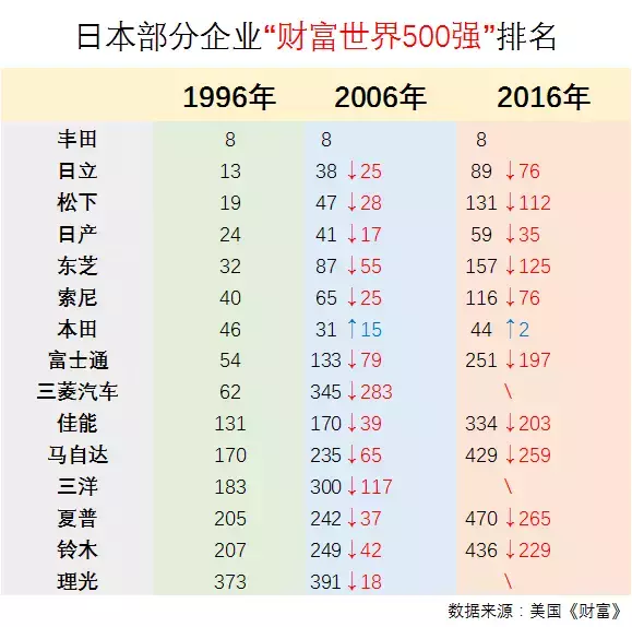 与之对应的,日本“财富世界500强”企业数量,从1996年的99家,锐减至2016年的52家!