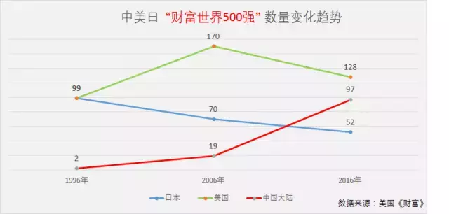 1996年,日本上榜企业多达99家,与美国并驾齐驱;2006年,减少至70家;2016年,仅剩52家,比20年前,锐减了近一半。