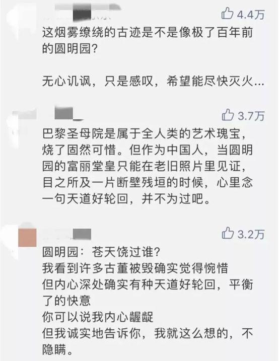 况且,这样的民族情绪,也是狭隘的。有人说,觉得巴黎圣母院烧了没所谓的人,跟当年烧了圆明园的人,是同一群人。