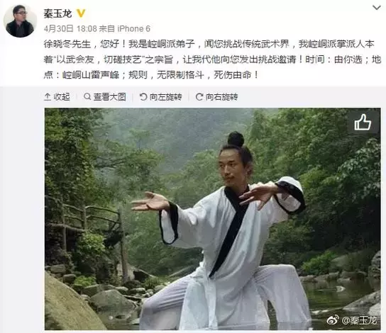首先跳出来的是少林武僧一龙,面对徐晓冬的挑战,他发布微博,表示对徐晓冬的不屑。