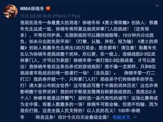今天凌晨,徐晓冬表示要与各派高手一决高下,要改变中国武林的历史,甚至世界武林的历史。