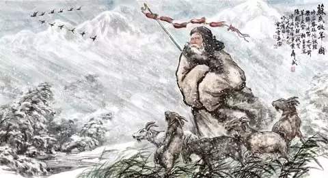 苏武在异国的冰天雪地中,正在打瞌睡,睡梦中一定是千万里远的家乡,一幅清冷、凄凉、愁惨的气氛,令人触目伤怀。 ▼