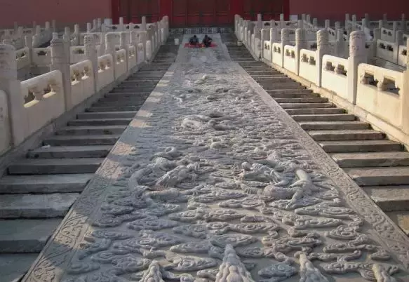 北京故宫中太和殿前的中道阶石长10米,宽3米,厚2米。明嘉靖年间,用牛拉滚木的方法运这块石头,花了巨大的人力和物力。