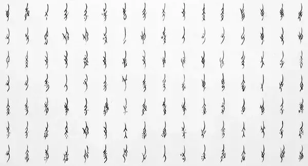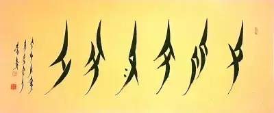 它的写法脱胎于汉字,是汉字的变异。外形呈长棱形的“多”字体势,斜体修长,清秀舒展,造型奇特,古意盎然。