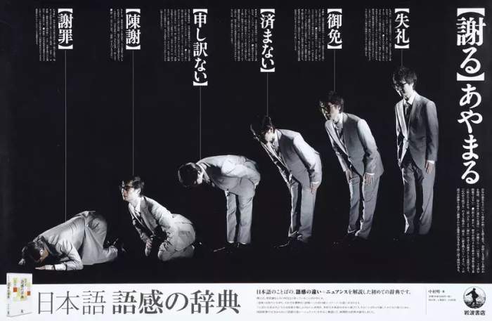 日本人可以算是最爱道歉的民族了。无论是在现实生活中,还是在日剧、电影或者动漫作品里,最常见的就是忙着道歉的日本人。日本人把“对不起”当成了口头禅用,曾有旅日的留学生说,想融入日本社会,要学会的第一件事,就是道歉。