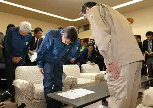 福岛核事故后,东电高管和福岛县知事道歉,双方互相鞠躬