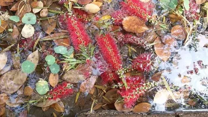 一场新雨后,我在尼赫鲁公园的小径上,在浸泡着枯叶的水潭中,捡起一枚垂枝红千层的花朵。经不住一夜暴雨的洗礼,在这个落叶缤纷的季节从枝头打落,赴一场死的静美。垂枝红千层,又名Weeping Bottlebrush Tree,直译过来就是哭泣的瓶刷子树,但却顾名思义解释了花朵的形状,其花型如同一支红色的瓶刷子。