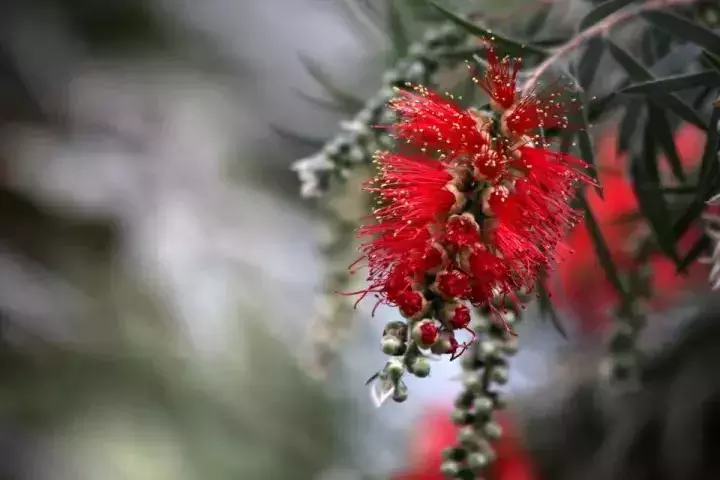 这种原产于澳洲新南威尔士及昆士兰的热带树种,如今已在全球不少地区成为高贵的园林树种。浸泡在雨水中的哭泣的瓶刷子花儿,就像是约翰·艾佛雷特·米莱笔下的《奥菲利亚》,安躺在幽静的小河里,四周绿树成荫,藤蔓缠绕,花草芬芳,少女奥菲利亚无神的双眼与微张的双唇好像在哼着歌,又好像在诉说着什么。