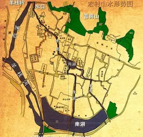宏村整体像一只水牛:山为牛首,树为牛角,桥为牛腿,月沼是牛胃,南湖是牛肚,水圳是牛肠,人家是牛身。