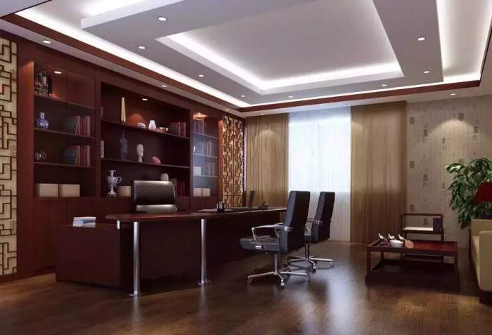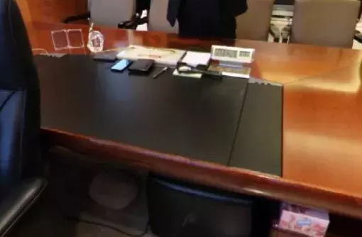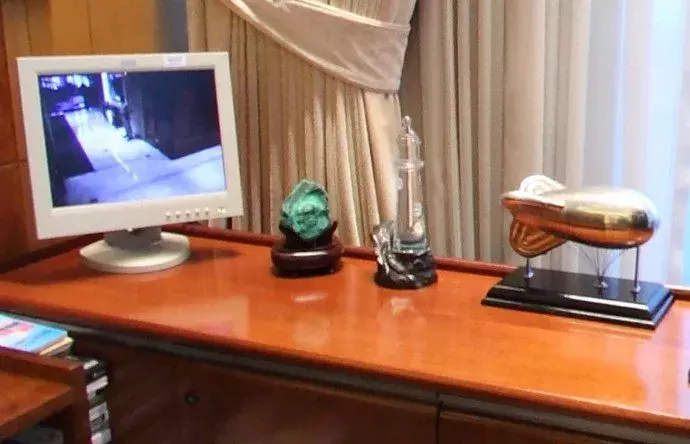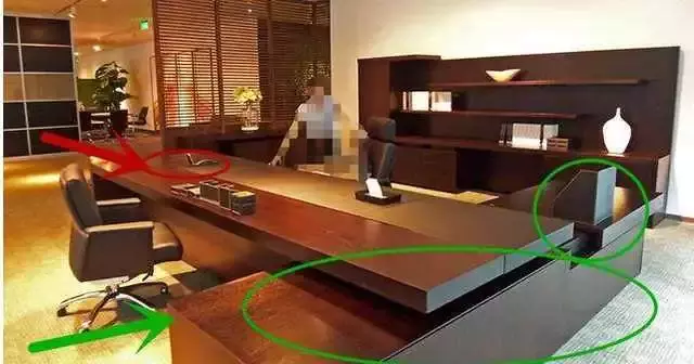 他的办公桌后面专门摆放了一个条柜,这是最大的特色:能使办公室的财气不外泄,也可遮挡落地玻璃的反光及不吉。