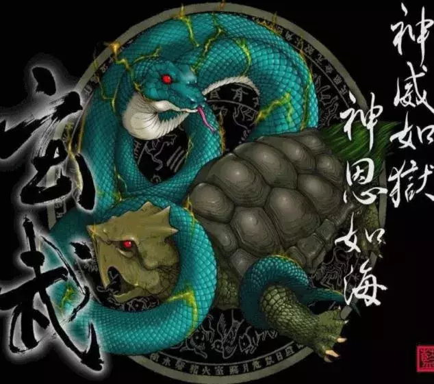 北方阴寒,有黑色的水,水里有龟,龟蛇缠绕,名为玄武。