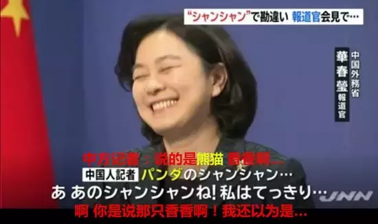 去年在中国外交部的例行记者会上,一名日本记者用英语询问华春莹,对于大熊猫“香香”在东京公开亮相有何评价时,因为发音问题,华春莹把“香香”听成了日本外务省事务次官“杉山”,严肃地回答了问题。