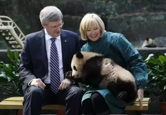 加拿大前总理斯蒂芬-哈珀与夫人抱起一只熊猫