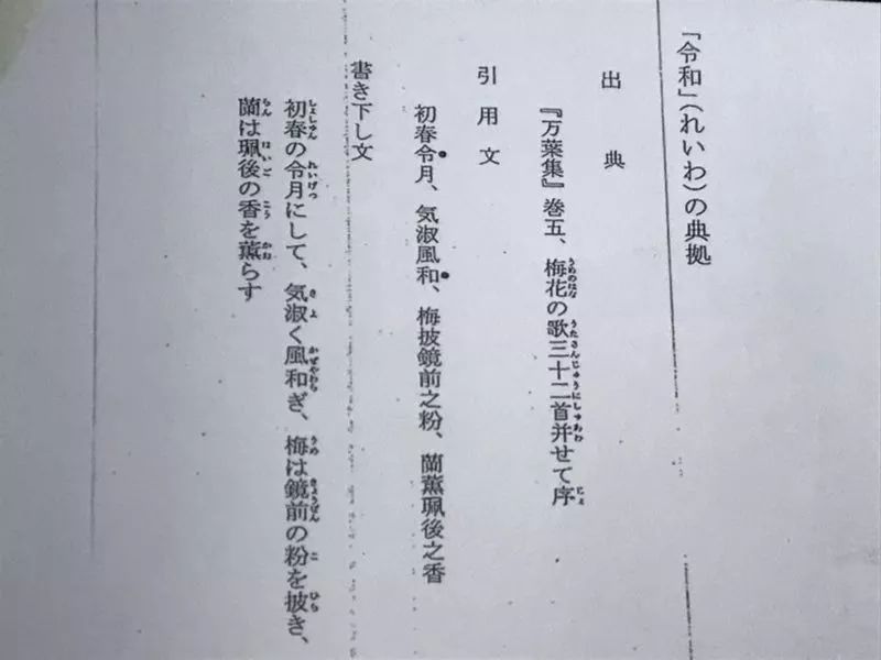 “令和”取自日本现存最古老的诗歌总集《万叶集》中的“初春令月,气淑风和”。