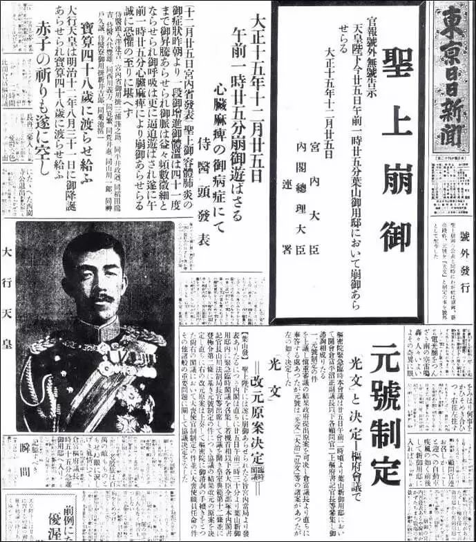 ▲ 图为1926年12月25日《东京日日新闻》号外,由于按照法定程序新年号确定前会提供若干候选,日媒有时为抢先发布新年号会搞出“大乌龙”,当年这一报道就是误报新任裕仁天皇的年号为“光文”,而最终选定的年号为“昭和”