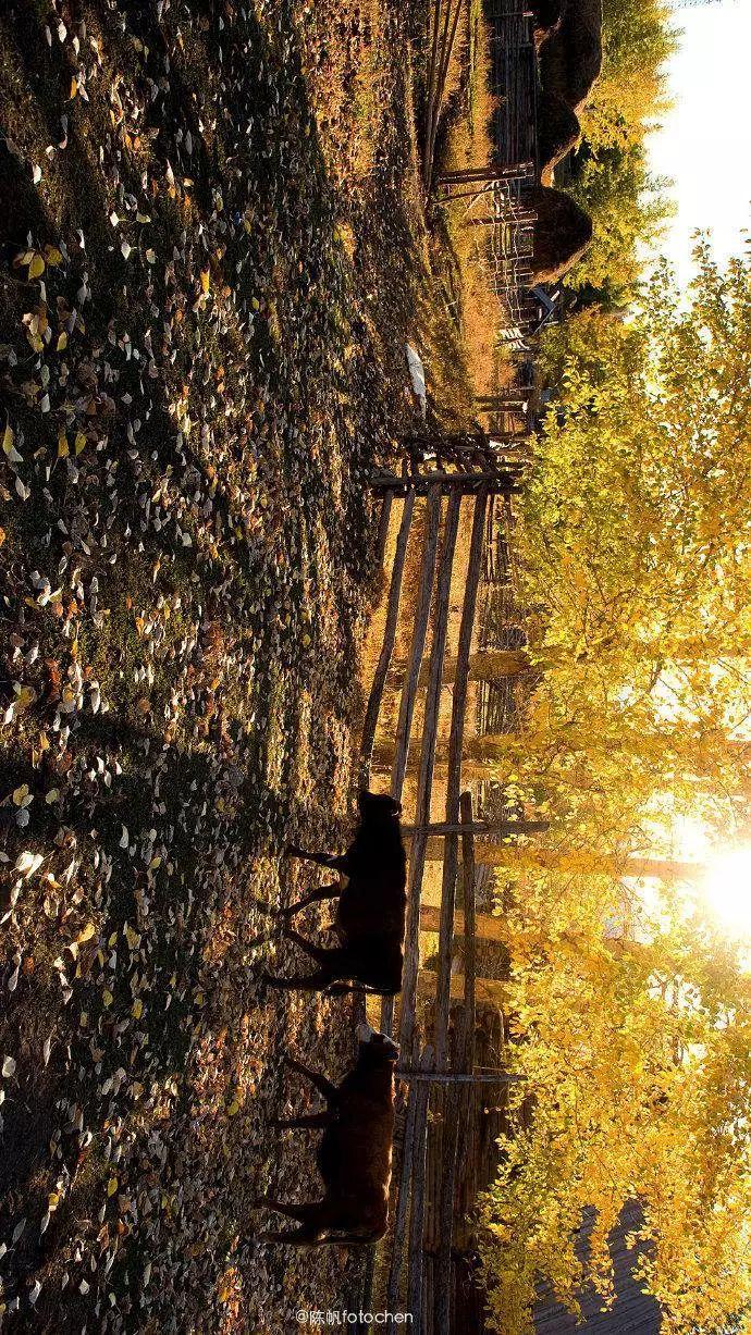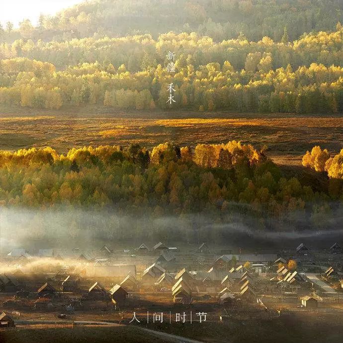 是晨辉里的新疆白桦林,图瓦人的小木屋升起了袅袅炊烟。