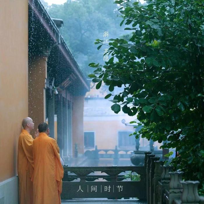 是雨声里的浙江灵隐寺,檐下的僧人合掌低语,抬眼是葱郁的青山。