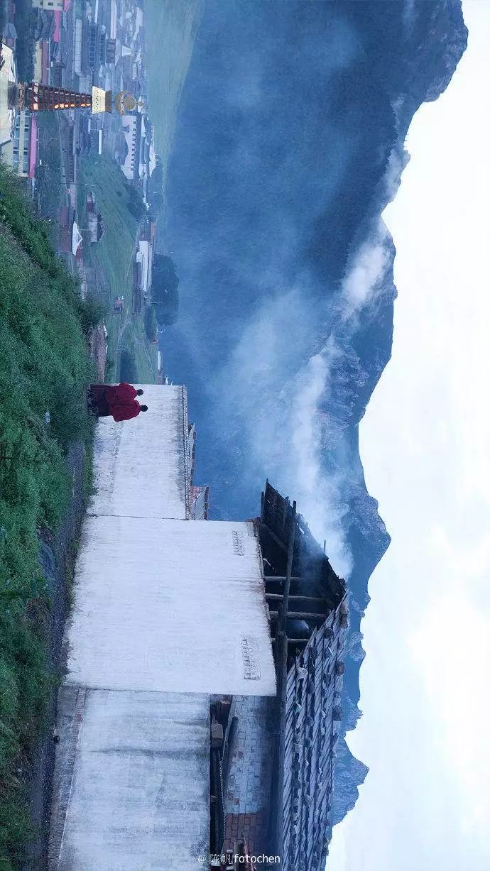 陈帆描绘当时的场景:第一缕阳光穿透山脊的雪层,洒落在佛学院的山顶。瞬间有一种光明初降的错觉。大大小小的经殿仿佛刹那间从深夜中被唤醒,金光熠熠,晨雾、烟云交织在一起,在佛学院的上空缓缓地流动,云蒸霞蔚,虚无缥缈。
