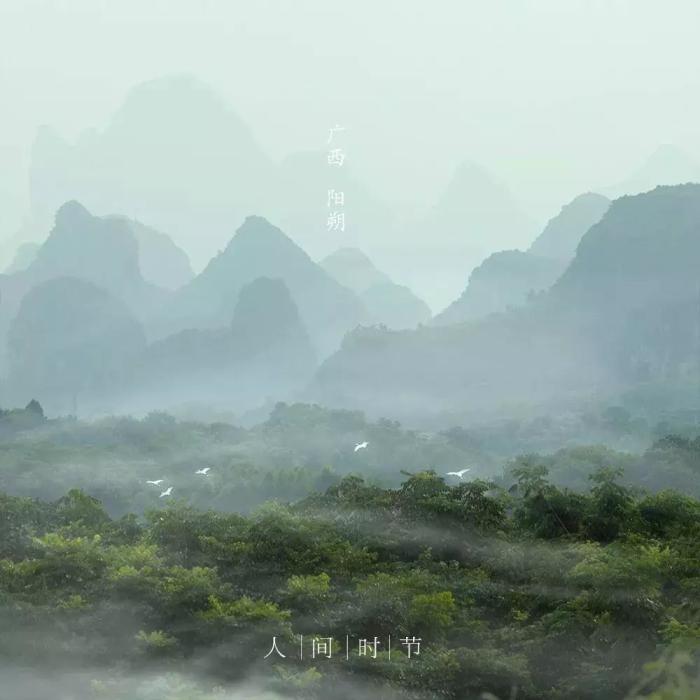 是清晨的广西阳朔,起伏的山尖在缥缈的云雾中若影若现。