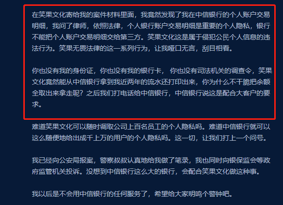 中信银行在没有他身份证、银行卡和司法机关调查令的情况下,把他近两年的银行流水打印出来,交给了经纪公司笑果文化。