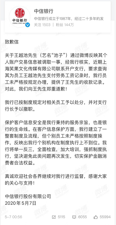在事情发酵后,迫于压力,中信银行选择在次日凌晨发表声明: