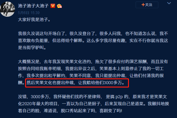 在池子微博中,我们得知:他曾多次要求和平解约,笑果文化都选择拒绝,同时提出向池子索赔3000万元。