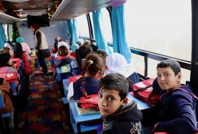 伊拉克首都巴格达,孩子们坐在公交巴士内倾听老师的讲课。这样流动性的课堂,能够勉强应对流军的追击。