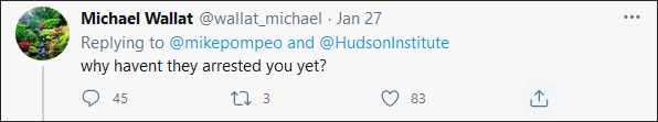 今年的1月27日,蓬佩奥发推宣布,自己将于2月1日正式加入哈德逊研究所。